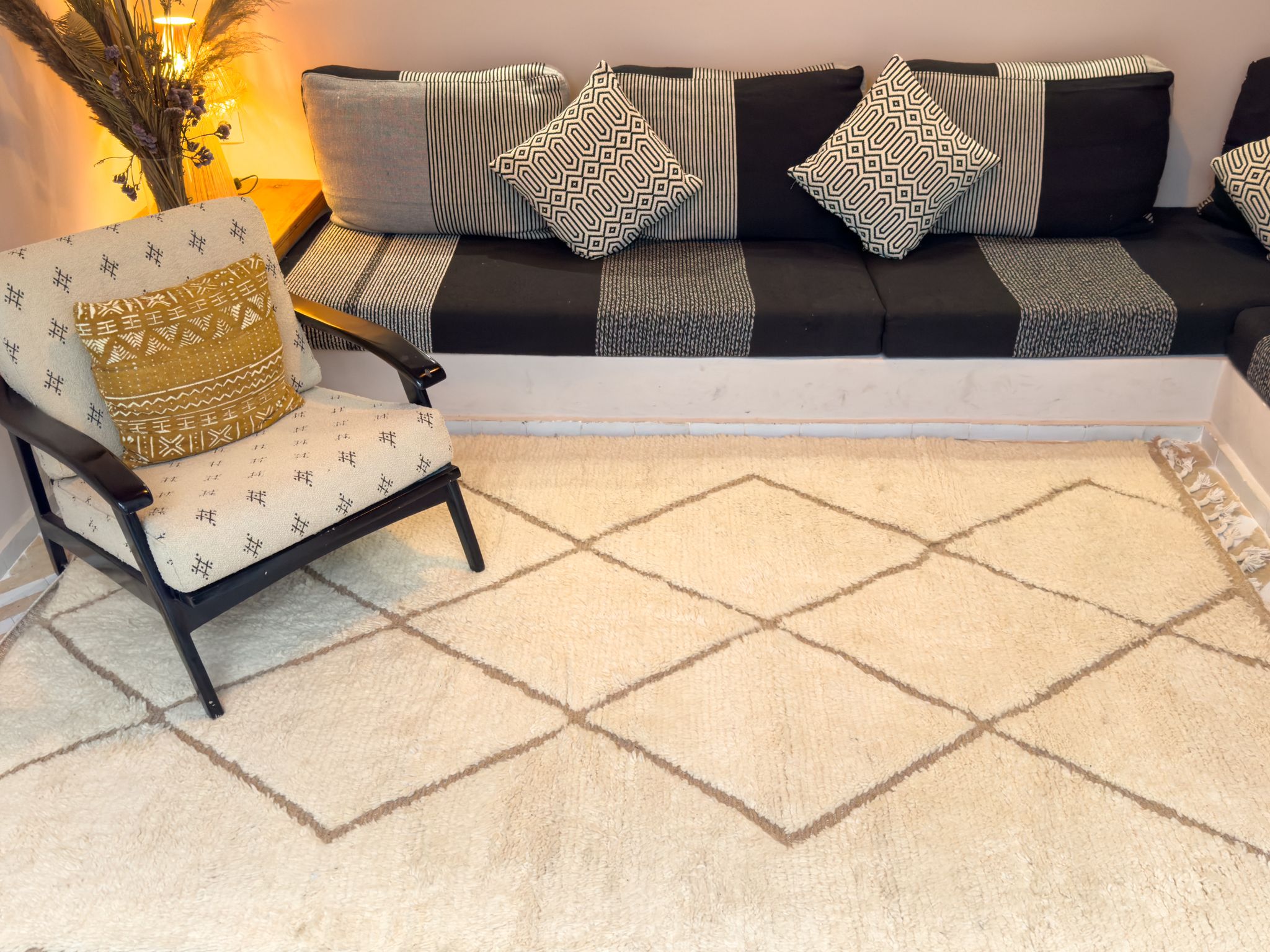 Apportez une touche d’authenticité et de chaleur à votre intérieur avec notre véritable tapis berbère beige, une pièce unique issue de l’artisanat marocain. Fabriqué à la main dans les montagnes du Moyen Atlas par des artisanes talentueuses, ce tapis est conçu sur des métiers à tisser traditionnels, garantissant une qualité exceptionnelle et un design unique.
